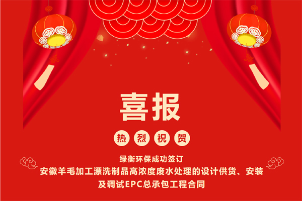 熱烈祝賀綠衡環保成功簽訂安徽羊毛加工漂洗制品高濃度廢水的設計...